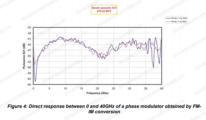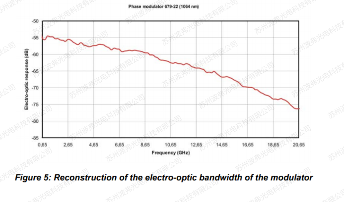 最終產生的強度調制的振幅取決于頻率f、濾波器的δf、先前校準過的驅動電壓以及要確定的調制器的頻率響應。重要的一點是,必須工作在小信號模式以適應信號Vo的振幅。調制器的電光響應S21必須用頻率f歸一化。頻率越高,精度越高。在圖5所示的結果上,頻率響應高于65MHz。