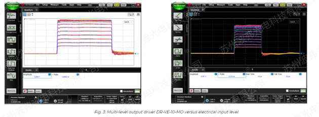 使用AWG,第一調(diào)制塊AM1用于產(chǎn)生超短光脈沖。采用iXblueNIR-MX800、MXER1300和MXER高對(duì)比度寬帶幅度調(diào)制器,分別在850nm、1310nm和1550nm處獲得70ps的超短光脈沖。調(diào)制器與驅(qū)動(dòng)器DR-VE-10-MO相結(jié)合,DR-VE-10-MO可被設(shè)置為方形或高斯脈沖,限幅或線性放大器。采用iXblue偏壓控制器MBC-DG-LAB,在高達(dá)數(shù)GHz的脈沖重頻下,獲得了較高的脈沖消光比穩(wěn)定性。