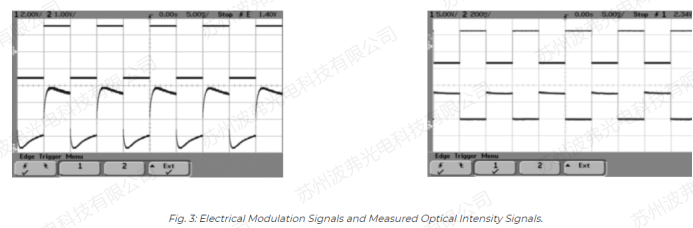 右圖:50KHz信號時無熱效應,上面曲線為射頻電信號,下面為光信號。