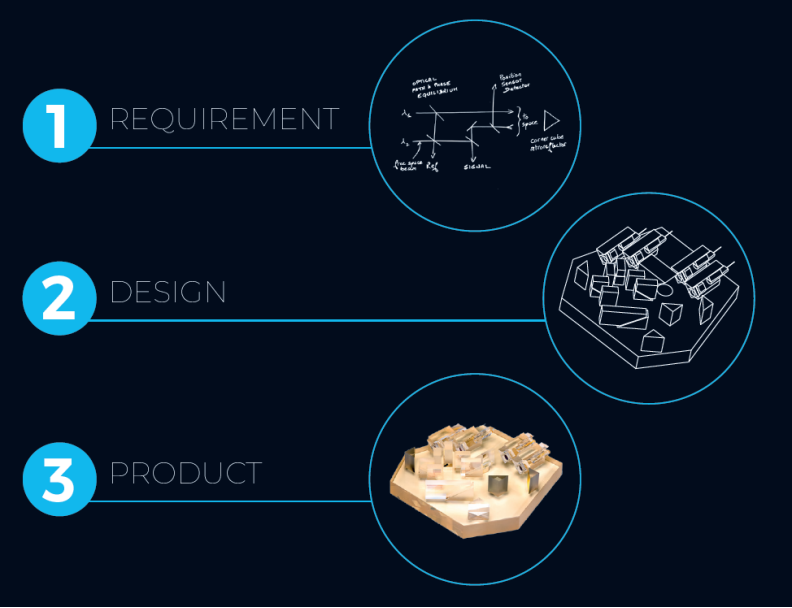 iXblue能夠?qū)嶒炑b置集成為工業(yè)級的光學模塊,從客戶要求(簡易的草圖,下圖步驟1)開始,iXblue可以領(lǐng)導或參與完整的產(chǎn)品開發(fā)步驟:設計(下圖步驟2)、原型機到批量生產(chǎn)(下圖步驟3),iXblue的專業(yè)技術(shù)在于將微光學元件超精確地組裝在玻璃基板上,在滿足光學性能要求的前提下提供更小的體積,優(yōu)異的可靠性和穩(wěn)定性。