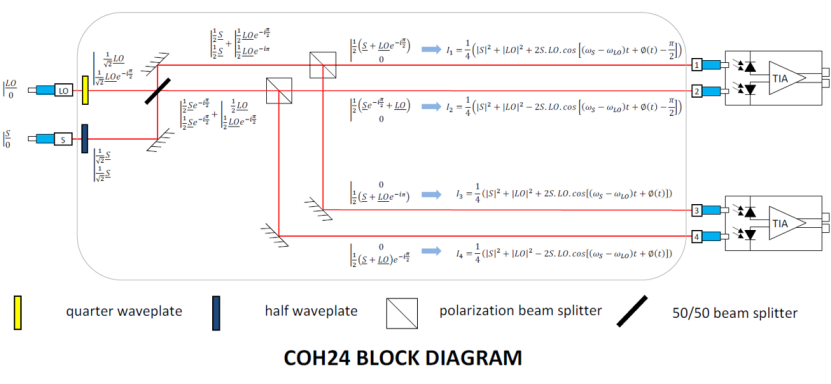 隨后產(chǎn)生了“QAM”技術(shù),這是一種使用電磁波相位和強度的調(diào)制技術(shù)。除了前面的優(yōu)點之外,該解決方案允許使用中間值(0和1之間,0和π之間)進行調(diào)制。它為信息編碼提供了更多的可能性。例如,QAM16和QAM64技術(shù)可以在單位比特時間內(nèi)處理4到6比特。這種信號的解調(diào)非常復雜,可以通過iXblue 90°光學混頻方案(iXblue COH系列,見下圖)實現(xiàn)。信號光的相位、振幅甚至偏振態(tài),通過信號光和本振光(特定頻率的參考光)之間執(zhí)行四次90°相位干涉。