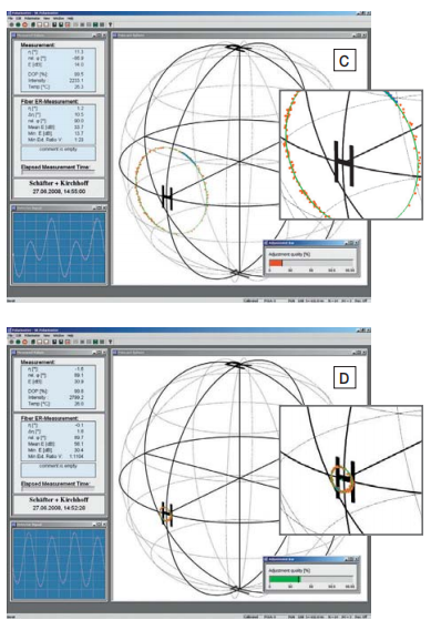 對于這些準直器,結果偏振經過調整,旋轉對應于龐加萊球上的 8 字形。 當到達兩極時設置圓偏振光,右旋圓偏振位于北極,左旋偏振位于南極。 如果光學器件的實際延遲偏離所需值,則極值不會到達兩極。 因此,偏振分析儀提供了光學器件實際延遲的測量值。