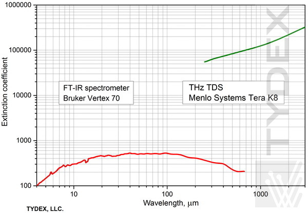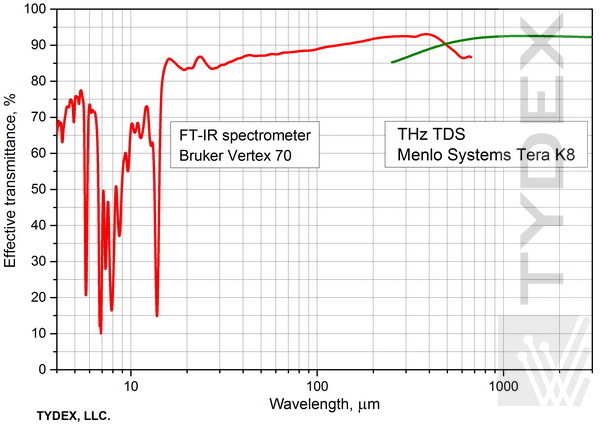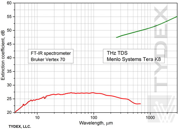 偏振器的透射光譜由兩臺儀器測量。 在 0.9 – 670 μm (333.1 – 0.45 THz) 的短波范圍內(nèi),使用了 FT 光譜儀 Bruker VERTEX 70。 在 150 – 3000 μm (2 – 0.1 THz) 的長波范圍內(nèi),我們使用了帶有 600 μm 偶極天線 (fc=0.5 THz) 的 Menlo Systems TERA-K8 太赫茲時域光譜儀。