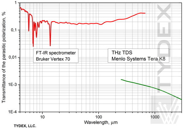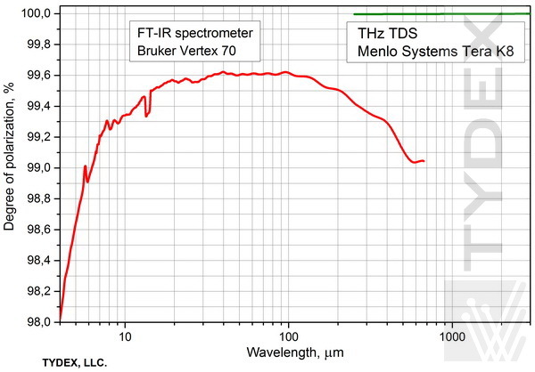 上面的曲線清楚地表明我們的偏振器在非常寬的波長范圍內(nèi)具有出色的質(zhì)量。 請注意,實際測量結(jié)果可能與上面給出的值不同,具體取決于光譜儀類型和測量模式。